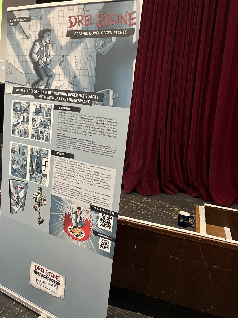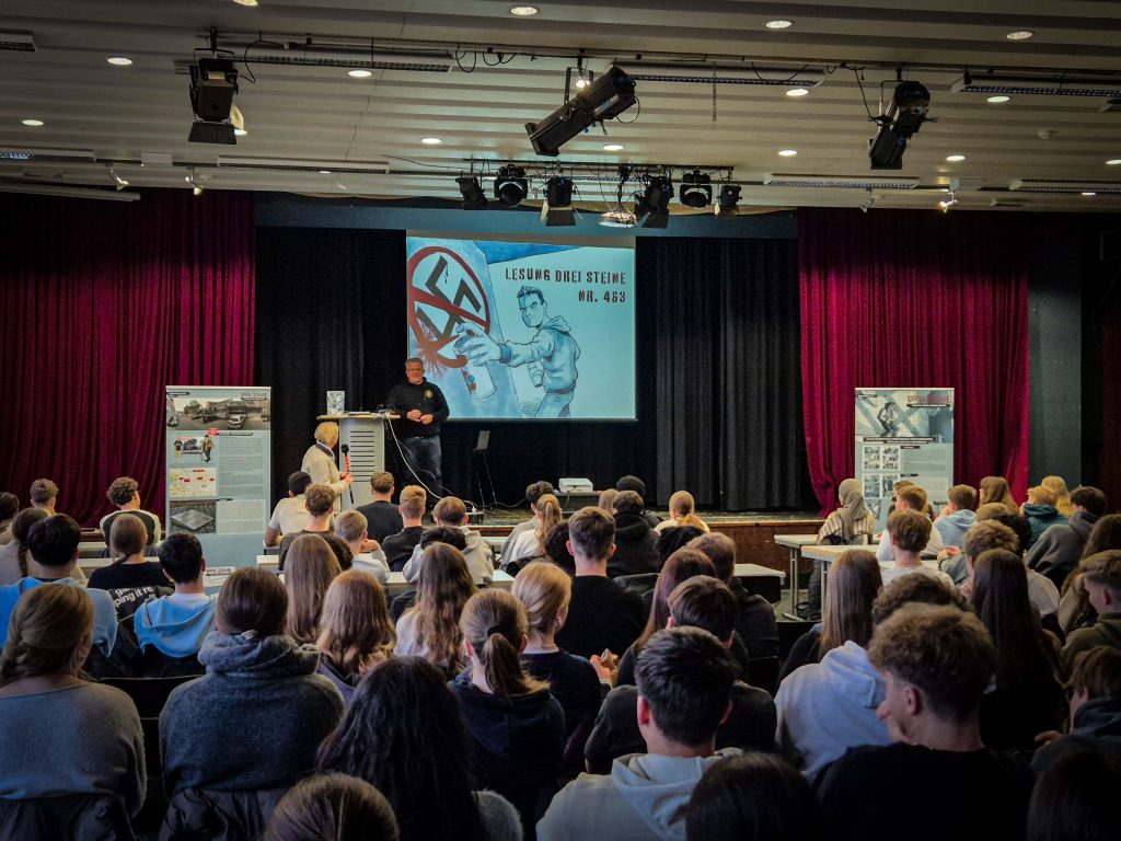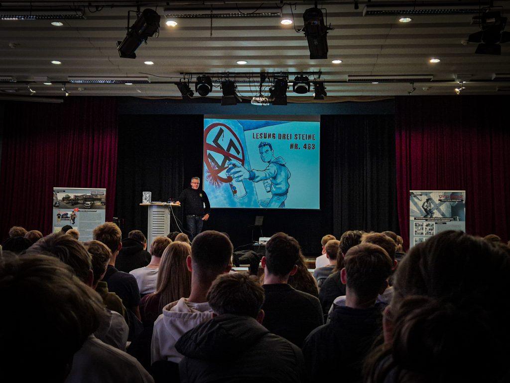 Klare Worte. Eindringliche Bilder. Unbequeme Gespräche. Die Graphic Novel „Drei Steine“ dokumentiert, wie Oskamp als Schüler Zivilcourage gegen Neonazis bewies, brutal zusammengeschlagen wurde und Mordanschläge knapp überlebte. Die Novel dokumentiert auch, wie Polizei, Familie und Schule diese Bedrohung verharmlosten. Und, dass einige der damaligen Täter nahezu ungestraft davon kamen, später ihren Weg in Politik und Wirtschaft fanden. „Es kostet manchmal Mut, aufzustehen und klar Stellung zu beziehen – aber genau das ist notwendig“, gab Oskamp seinen jungen Zuhörern mit.