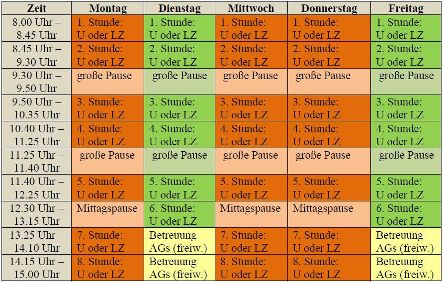 An drei Tagen in der Woche (Montag/Mittwoch/Donnerstag) haben die Schüler von 8 Uhr bis 15.00 Uhr Unterricht, dienstags und freitags endet der Unterricht um 13.15 Uhr. Danach können die Kinder bis 15 Uhr betreut werden oder an einer AG teilnehmen.